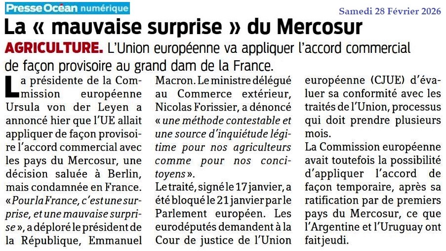 La « mauvaise surprise » du Mercosur - Presse Océan 28 février 2026