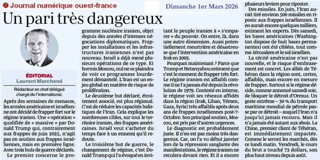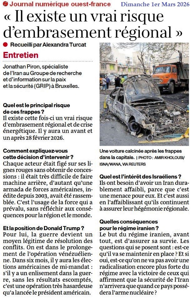 « Il existe un vrai risque d’embrasement régional » - Ouest-France 1er mars 2026