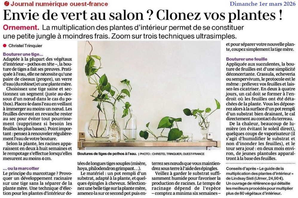 Envie de vert au salon ? Clonez vos plantes ! - Ouest-France 1er mars 2026