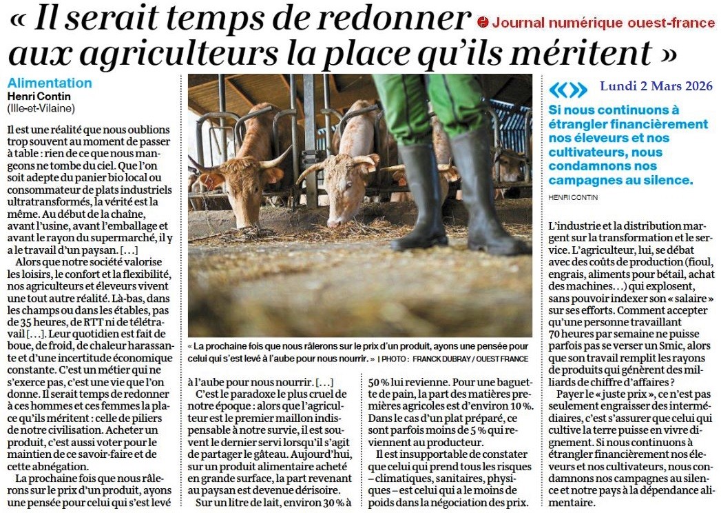 « Redonner aux agriculteurs la place qu’ils méritent » - Ouest-France 2 mars 2026
