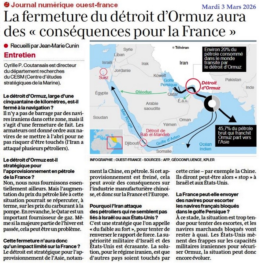 La fermeture du détroit d’Ormuz aura des « conséquences pour la France » - Ouest-France 3 mars 2026