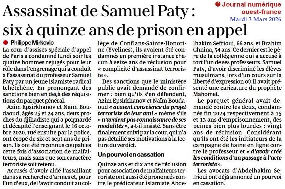 Assassinat de Samuel Paty : six à quinze ans de prison en appel - Ouest-France 3 mars 2026