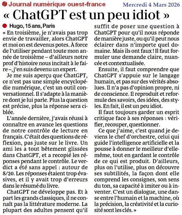 « ChatGPT est un peu idiot » - Ouest-France 4 mars 2026