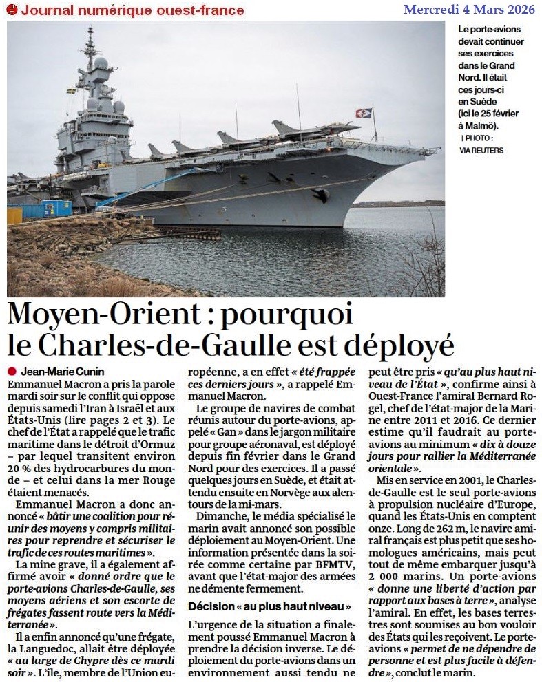 Moyen-Orient : pourquoi le Charles-de-Gaulle est déployé - Ouest-France 4 mars 2026