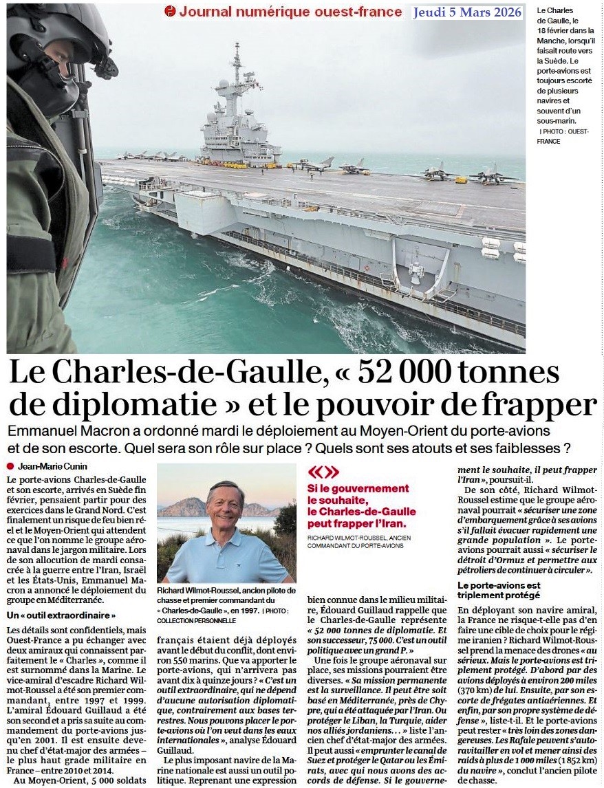 Le Charles de Gaulle, « 52 000 tonnes de diplomatie » et le pouvoir de frapper - Ouest-France 5 mars 2026