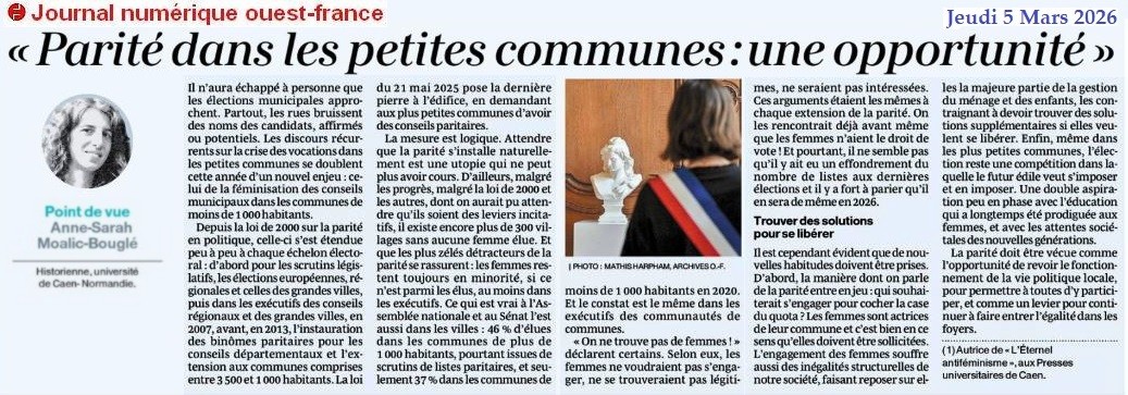 « Parité dans les petites communes : une opportunité » - Ouest-France 5 mars 2026