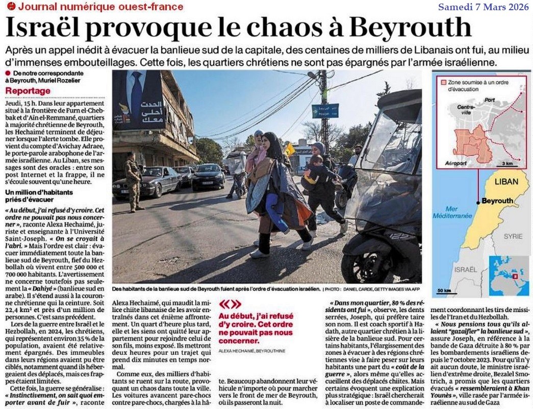 Israël provoque le chaos à Beyrouth - Ouest-France 7 mars 2026