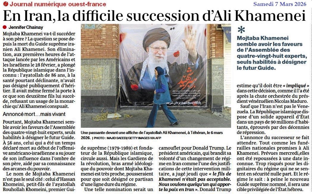 En Iran, la difficile succession d’Ali Khamenei - Ouest-France 7 mars 2026