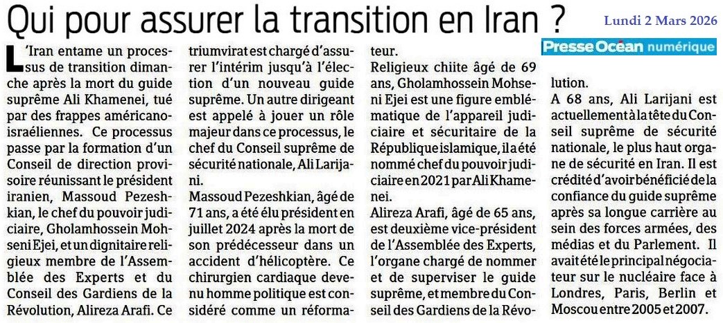 Qui pour assurer la transition en Iran ? - Presse Océan 2 mars 2026