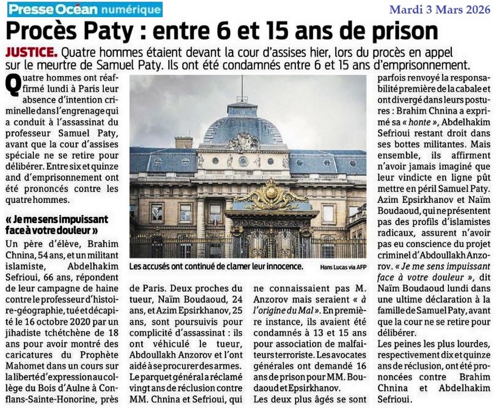 Procès Paty : entre 6 et 15 ans de prison - Presse Océan 3 mars 2026