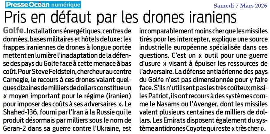 Golfe : Pris en défaut par les drones iraniens - Presse Océan 7 mars 2026