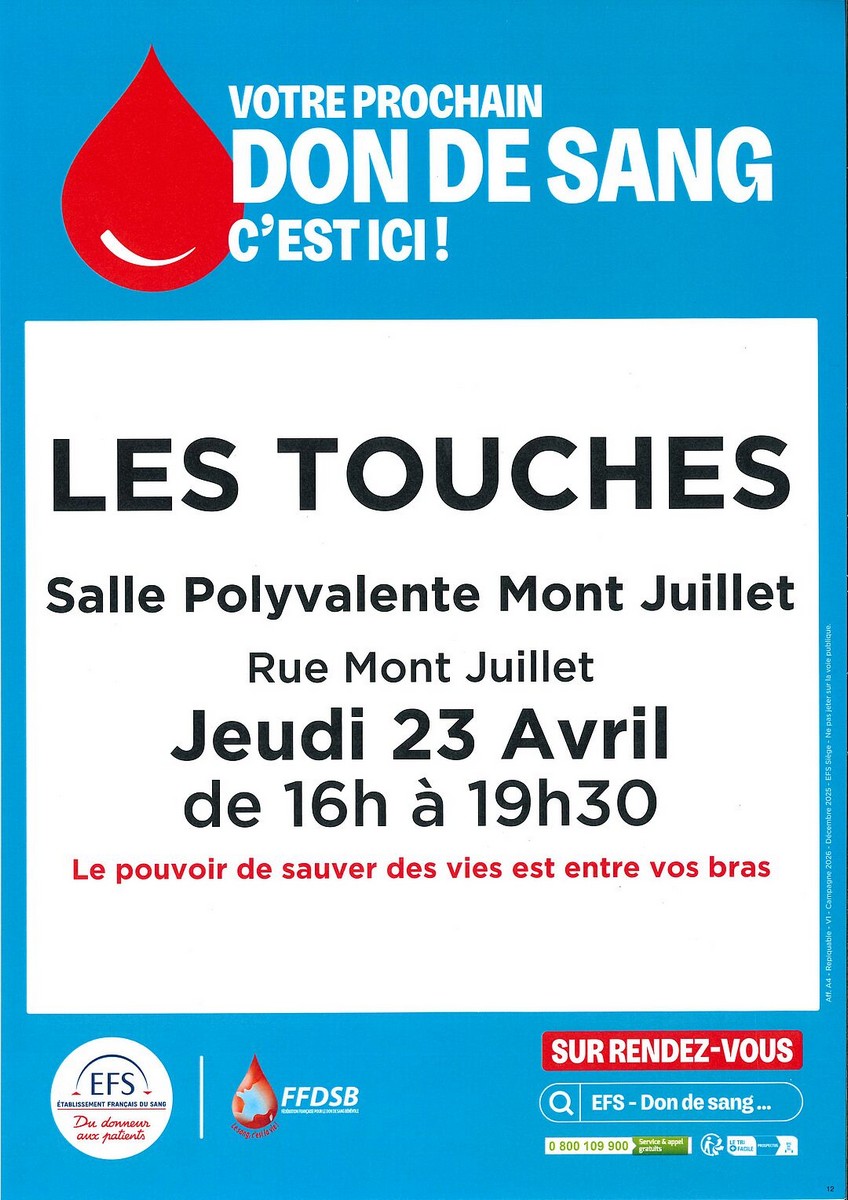 Don du sang jeudi 23 avril 2026 de 16 h. à 19 h.30