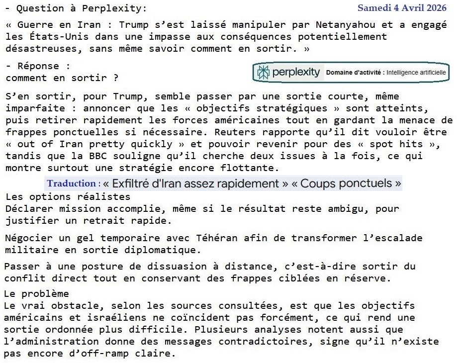 Trump s’est laissé manipuler par Netanyahou, commenr en sortir ? - Perplexity 4 avril 2026
