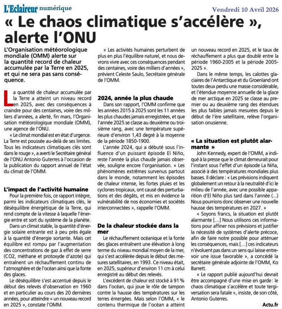 « Le chaos climatique s’accélère », alerte l’ONU - L’Eclaireur 10 avril 2026