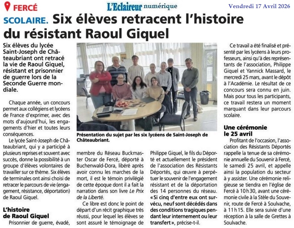 Six élèves retracent l’histoire du résistant Raoul Giquel - L’Eclaireur 17 avril 2026