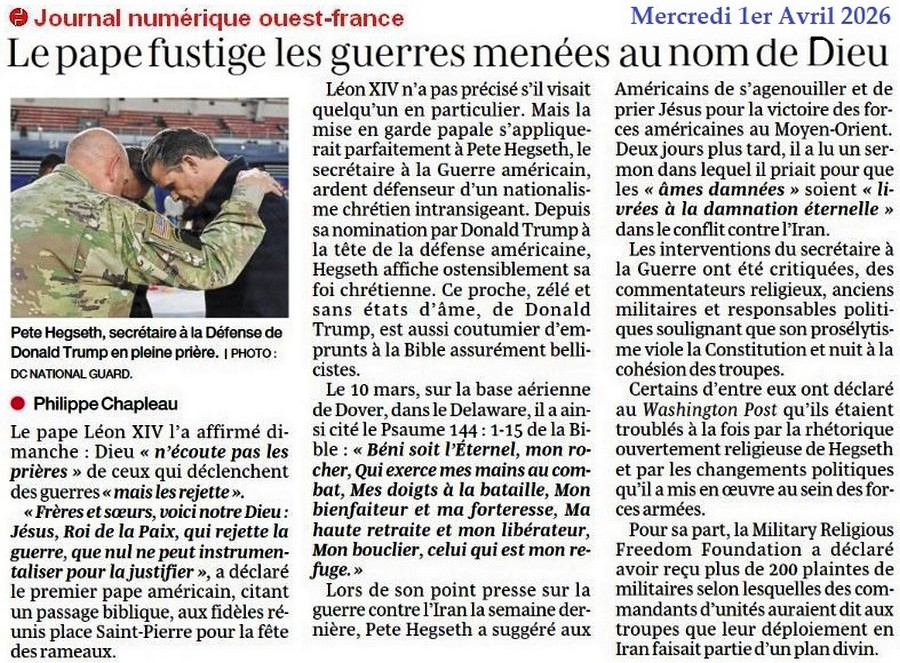 Le pape fustige les guerres menées au nom de Dieu - Ouest-France 1er avril 2026