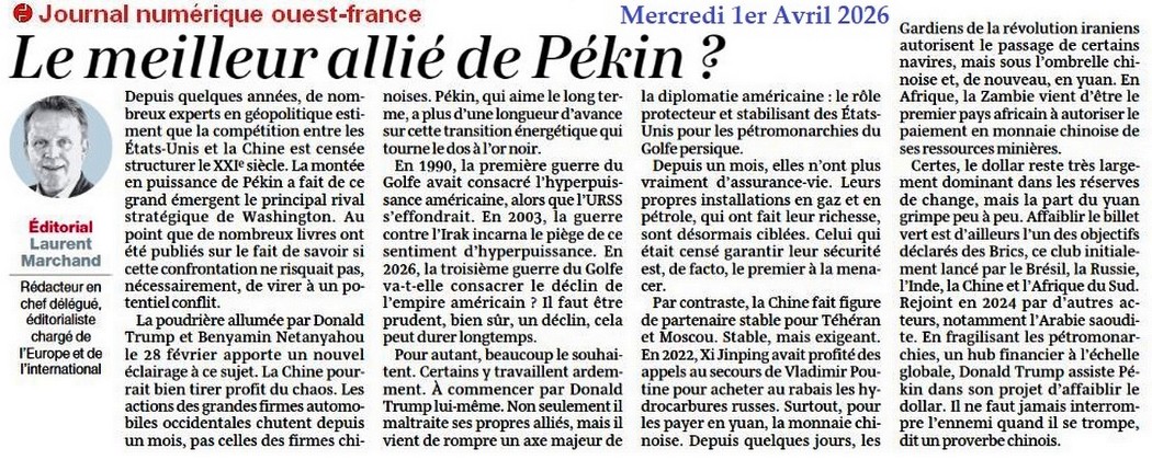 Le meilleur allié de Pékin ? - Ouest-France 1er avril 2026
