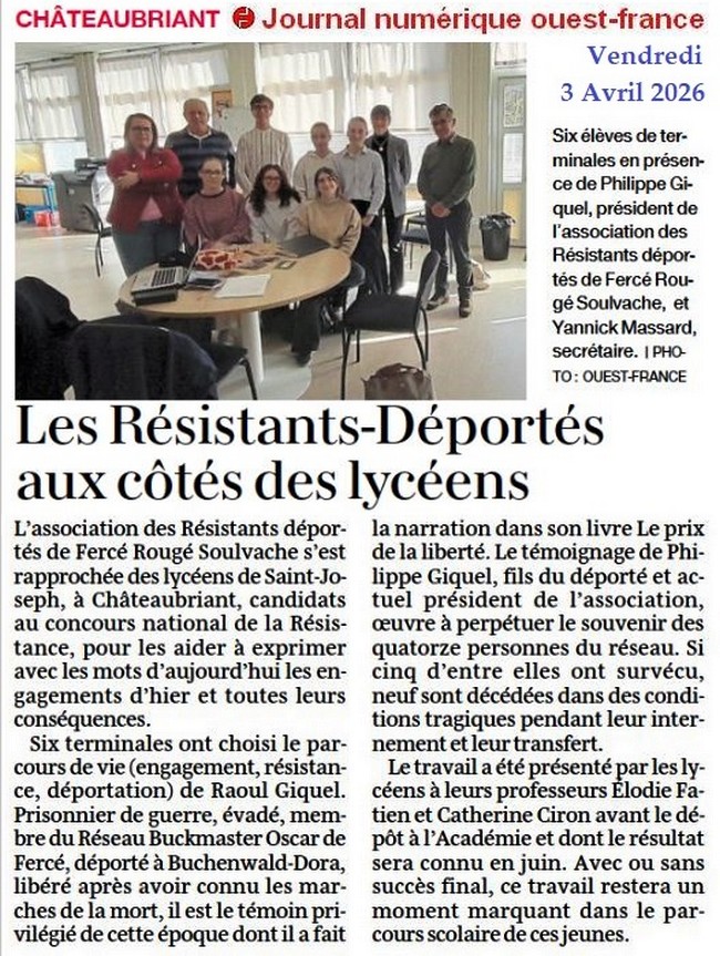 Les Résistants-Déportés aux côtés des lycéens - Ouest-France 3 avril 2026