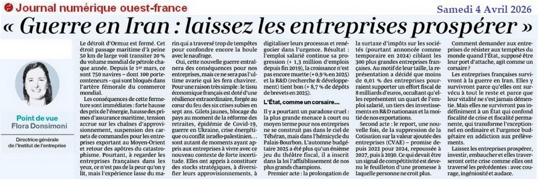 « Guerre en Iran : laissez les entrprises prospérer » - Ouest-France 4 avril 2026