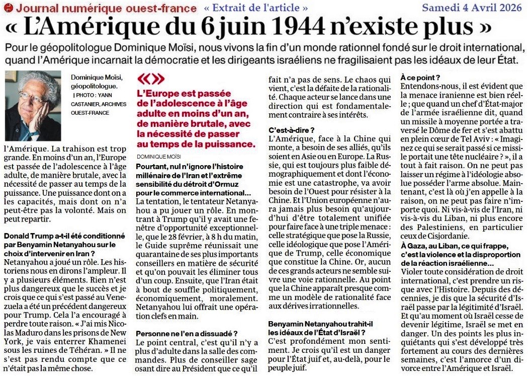 Extrait de l’article : « L’Amérique du 6 juin 1944 n’existe plus » - Ouest-France 4 avril 2026
