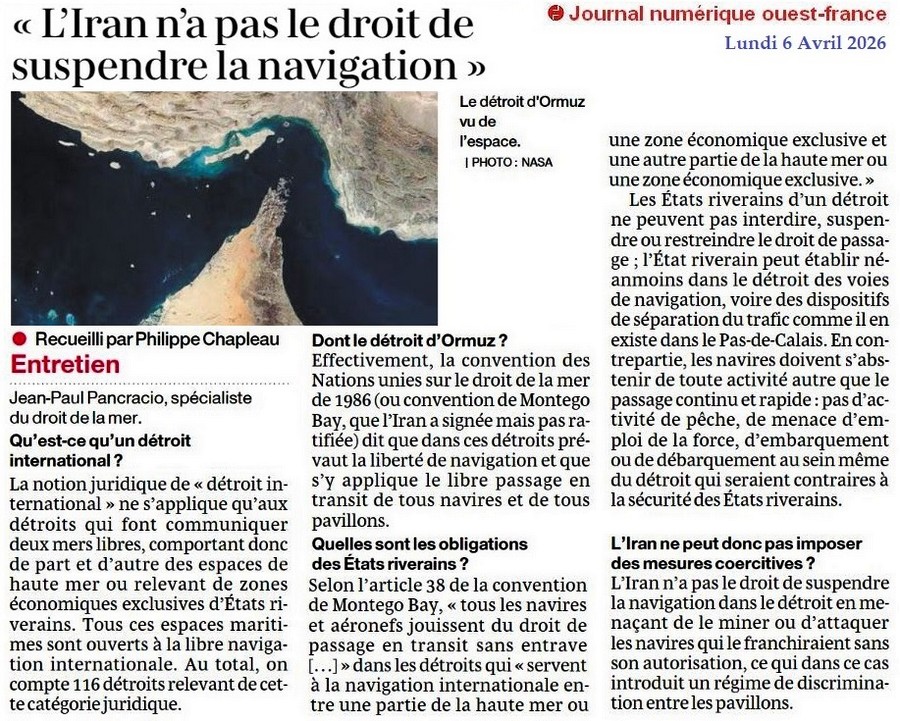 « L’Iran n’a pas le droit de suspendre la navigation » - Ouest-France 6 avril 2026