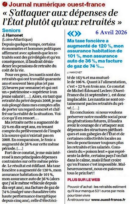« S’attaquer aux dépenses de l’Etat plutôt qu’aux retraités » - Ouest-France 6 avril 2026