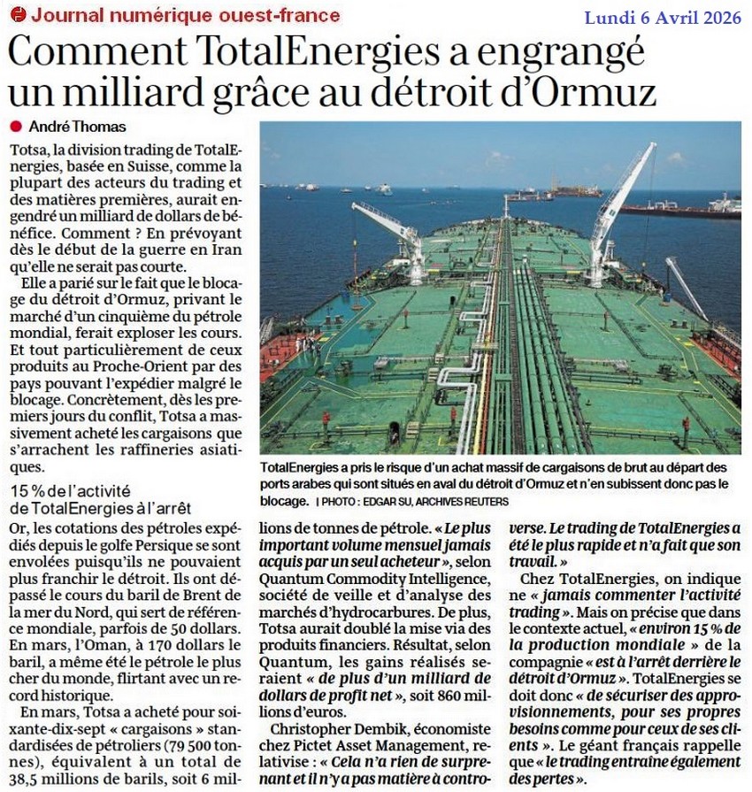 Comment TotalEnergies a engrangé un milliard grâce au détroit d’Ormuz - Ouest-France 6 avril 2026