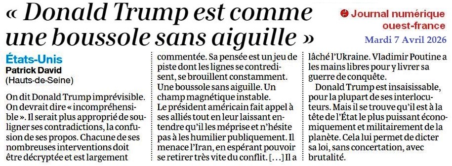 « Donald Trump est comme une boussole sans aiguille » - Ouest-France 7 avril 2026