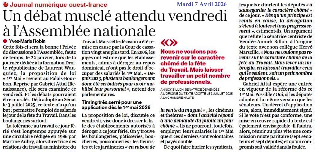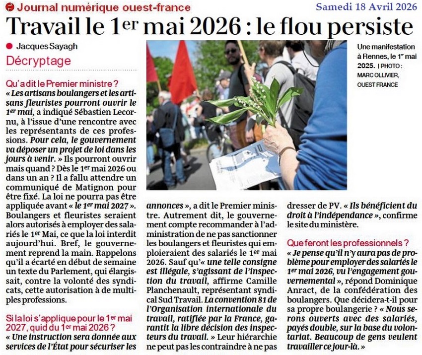 Travail le 1er mai 2026 : le flou persiste - Ouest-France 18 avril 2026