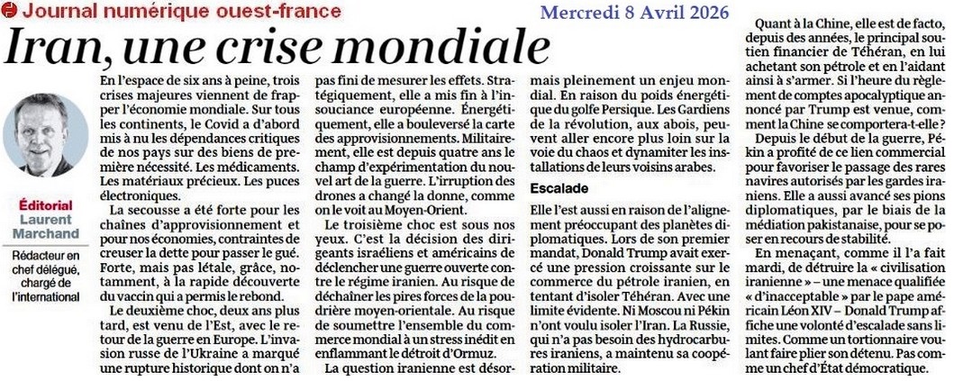 Iran, une crise mondiale - Ouest-France 8 avril 2026