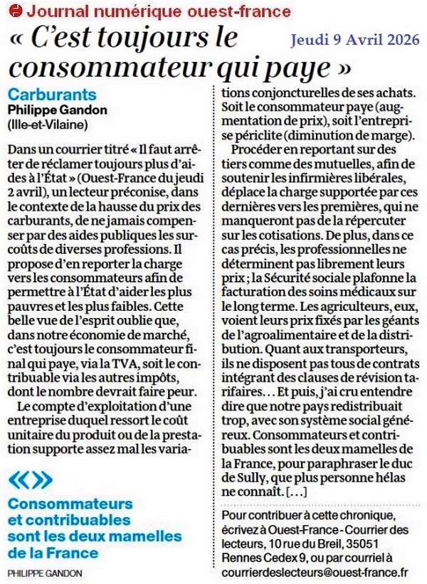 « C’est toujours le consommateur qui paye » - Ouest-France 9 avril 2026