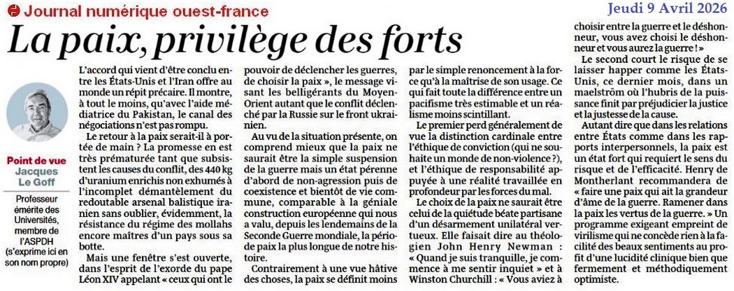La paix, privilège des forts - Ouest-France 9 avril 2026