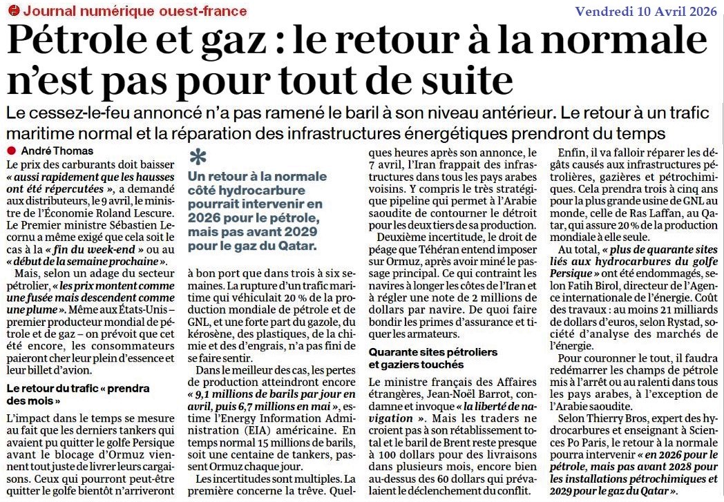 Pétrole et gaz : le retour à la normale n’est pas pour tout de suite - Ouest-France 10 avril 2026 - 1/2