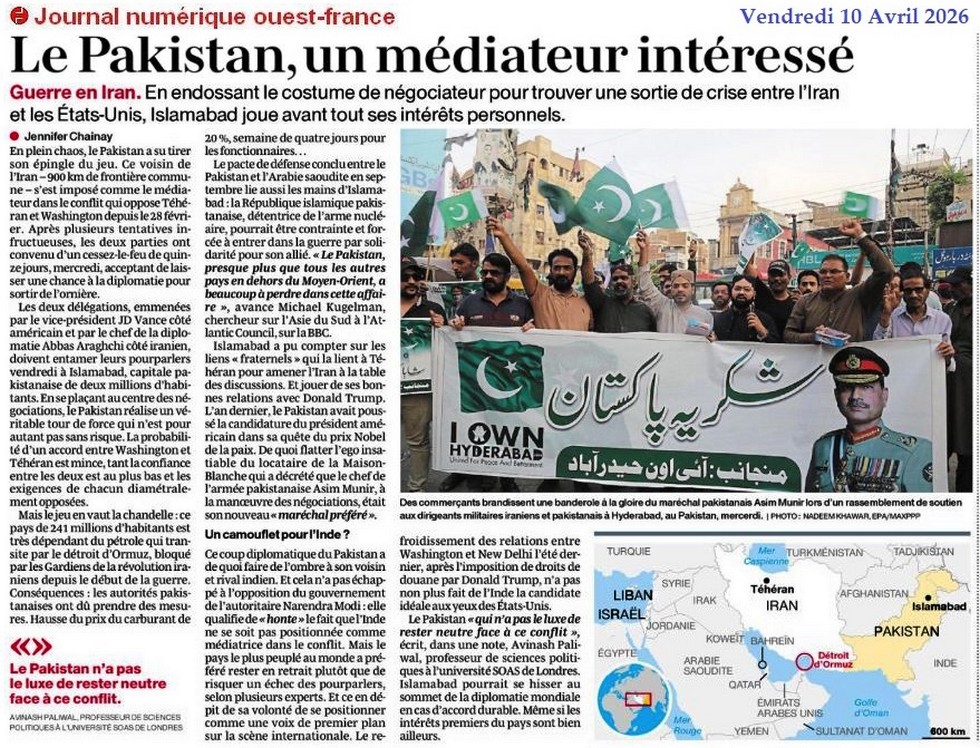 Le Pakistan, un médiateur intéressé - Ouest-France 10 avril 2026