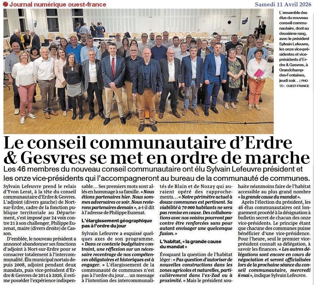 Le conseil communautaire d’Erdre & Gesvres se met en ordre de marche - Ouest-France 11 avril 2026 - 1/2