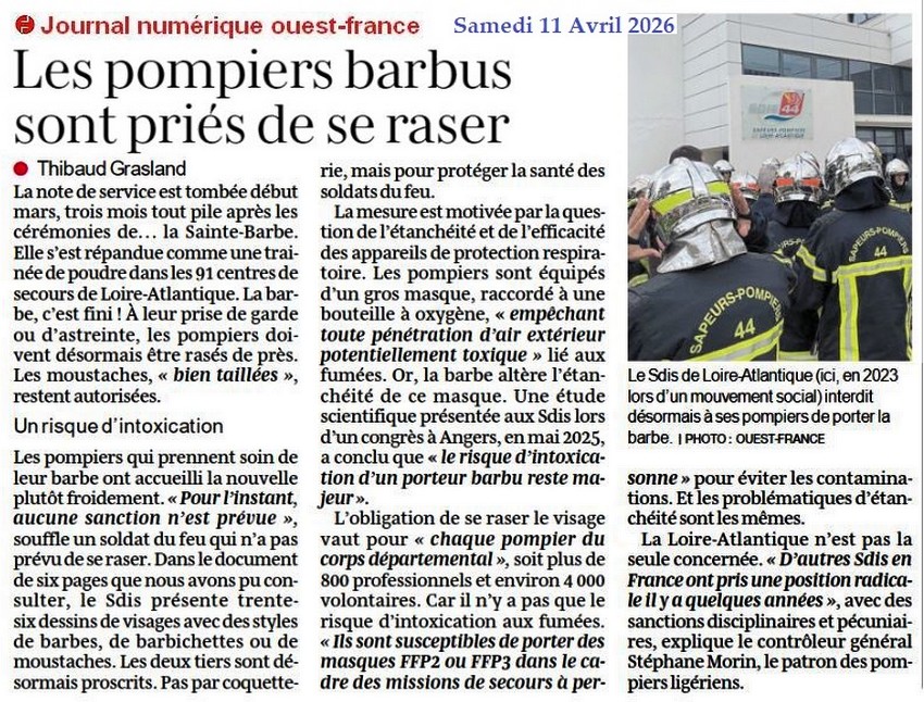 Les pompiers barbus sont priés de se raser - Ouest-France 11 avril 2026