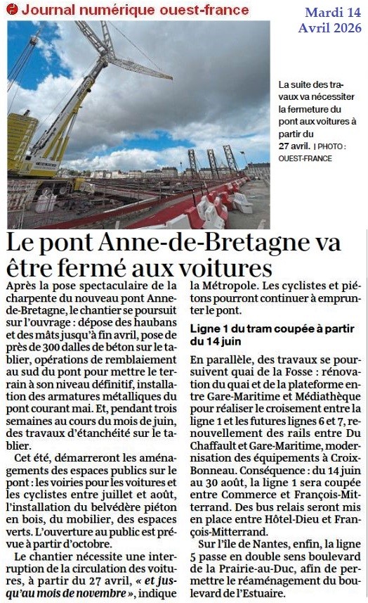 Le Pont-Anne-de-Bretagne va être fermé aux voitures - Ouest-France 14 avril 2026