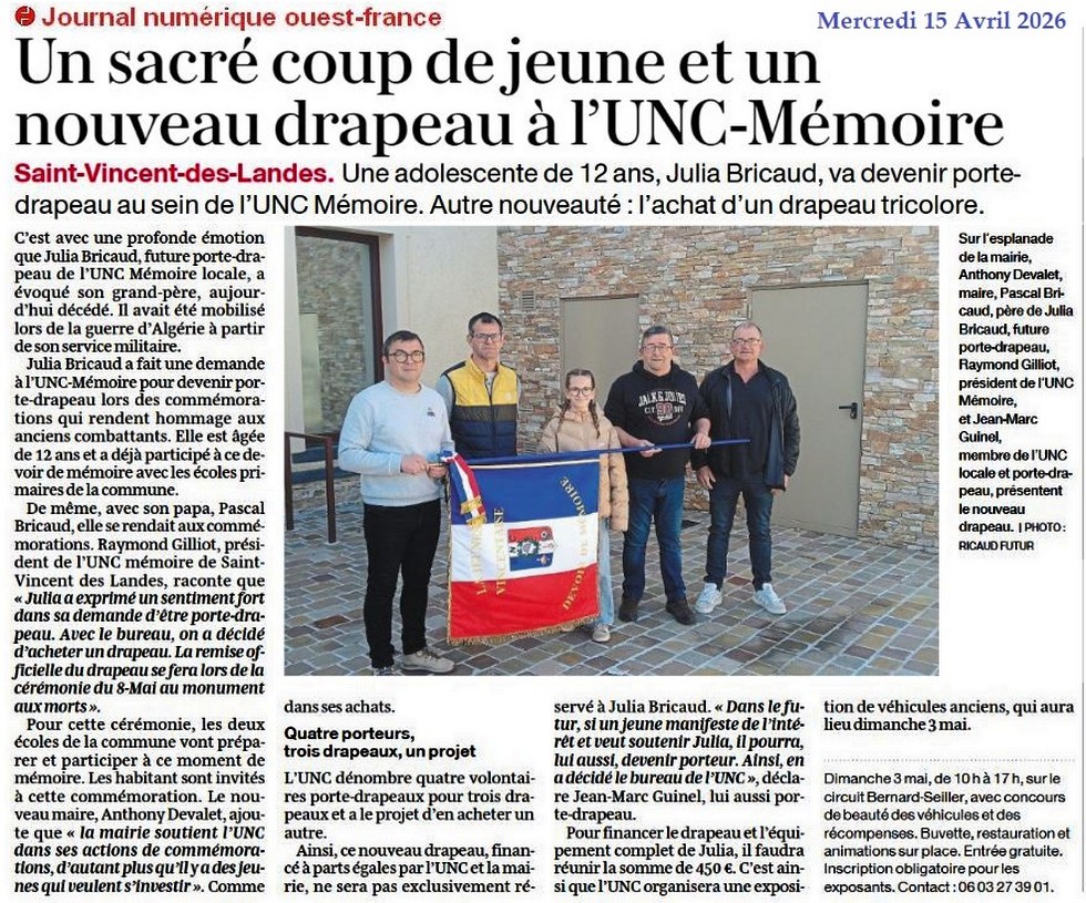 Un sacré coup de jeune et un nouveau drapeau à l’UNC-Mémoire - Ouest-France 15 avril 2026