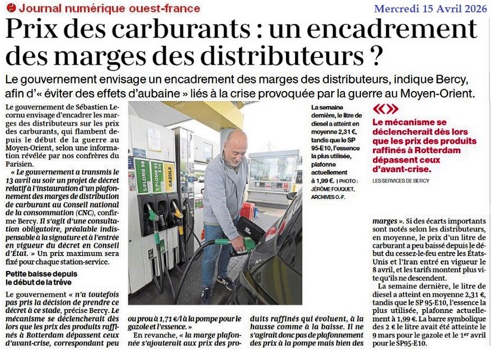 Prix des carburants : un encadrement des marges des distributeurs ? - Ouest-France 15 avril 2026