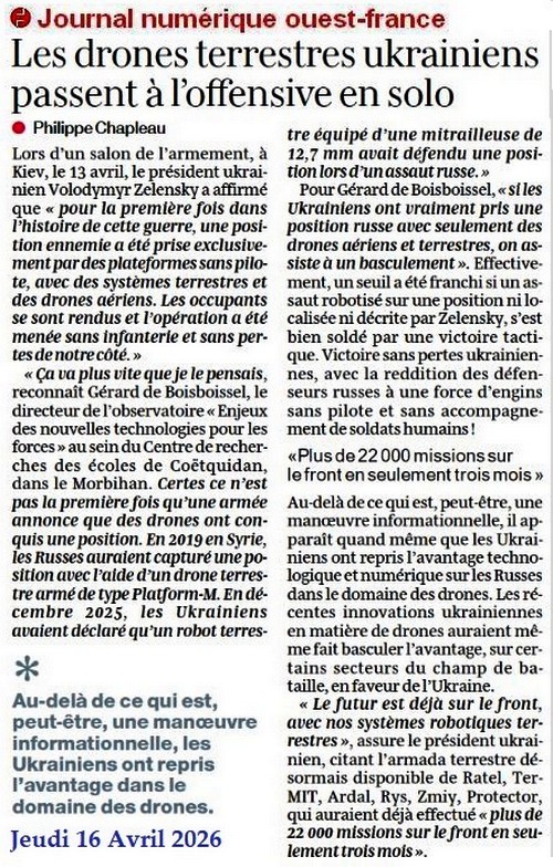 Les drones terrestres ukrainiens passent à l’offensive en solo - Ouest-France 16 avril 2026