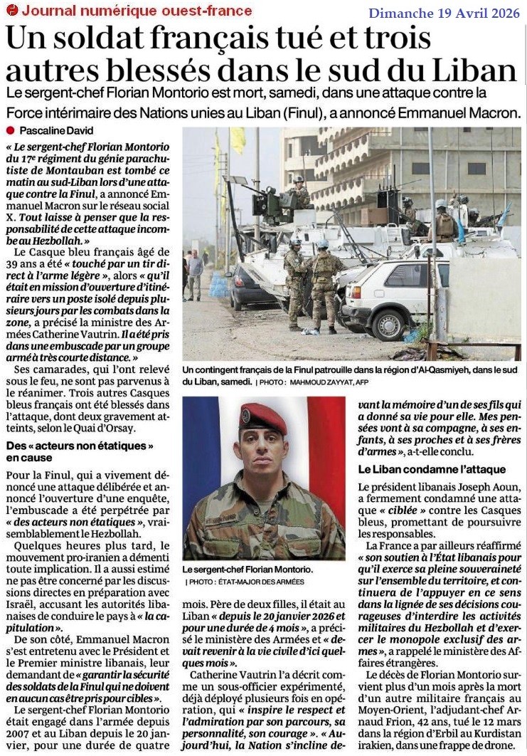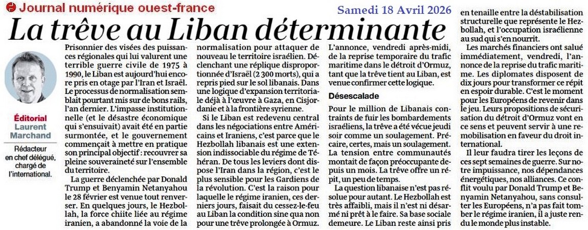 La trève au Liban déterminante - Ouest-France 18 avril 2026