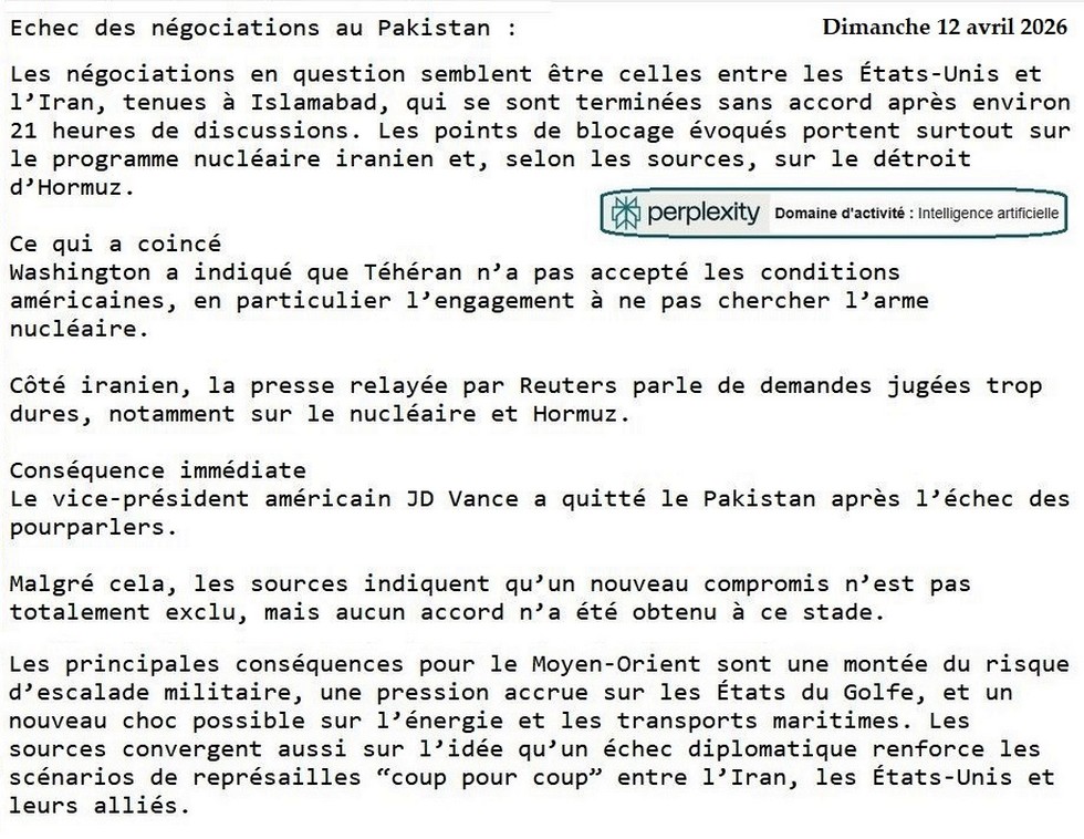 Echec de négociations au Pakistan - Perplexity 12 avril 2026 - 1/2