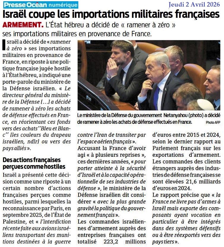 Israël coupe les importations militaires françaises - Presse Océan 2 avril 2026