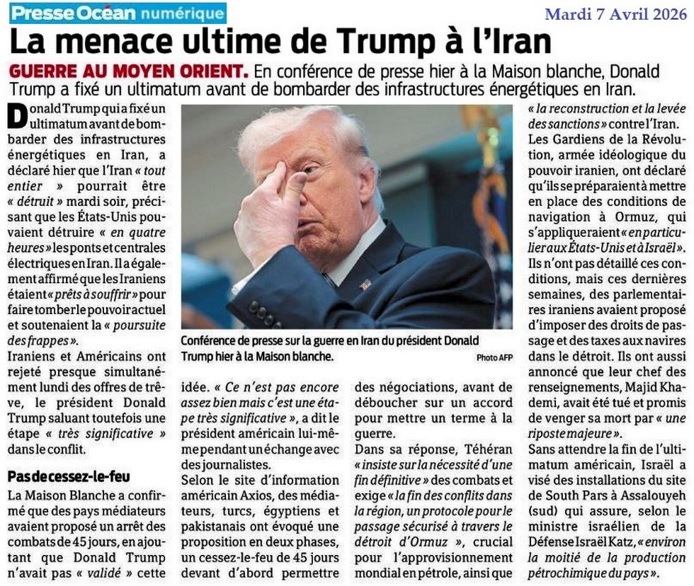 La menace ultime de Trump à l’Iran - Presse Océan 7 avril 2026
