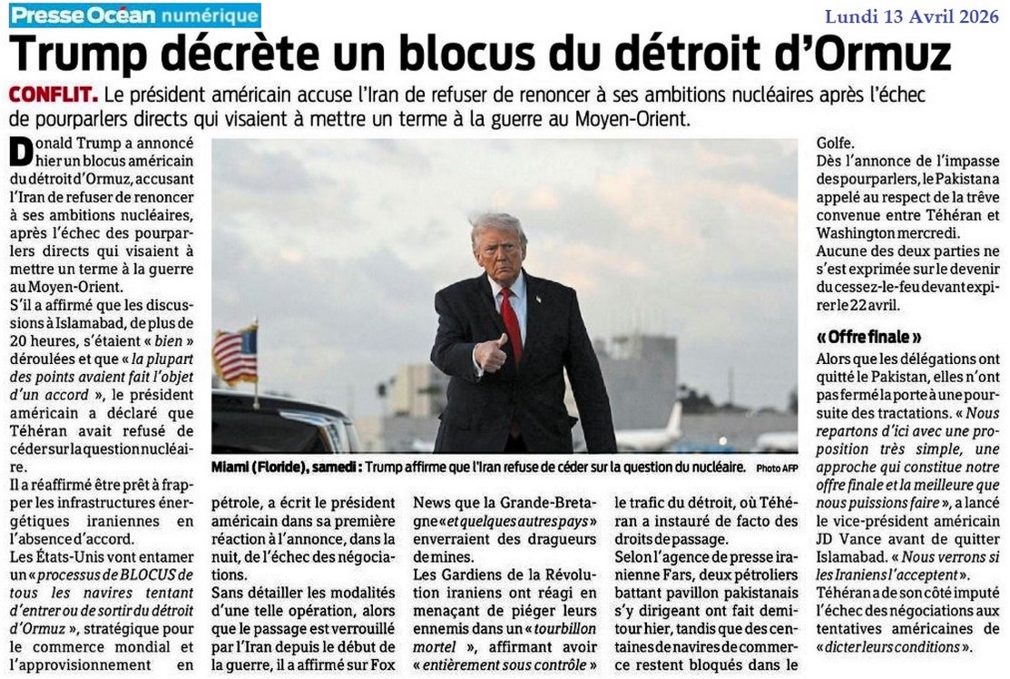 Trump décrète un blocus du détroit d’Ormuz - Presse Océan 13 avril 2026