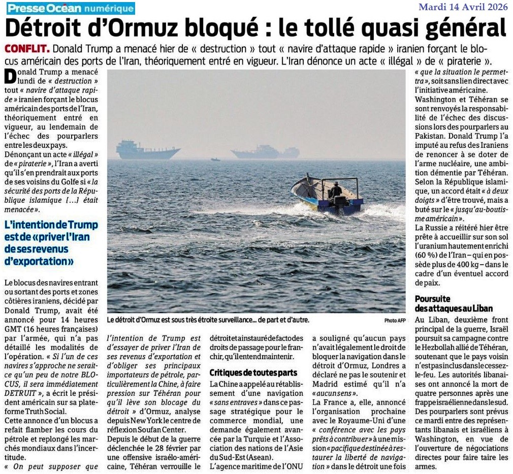 Détroit d’Ormuz bloqué : le tollé quasi général - Presse Océan 14 avril 2026