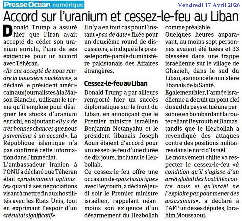 Accord sur l’uranium et cessez-le-feu au Liban - Presse Océan 17 avril 2026